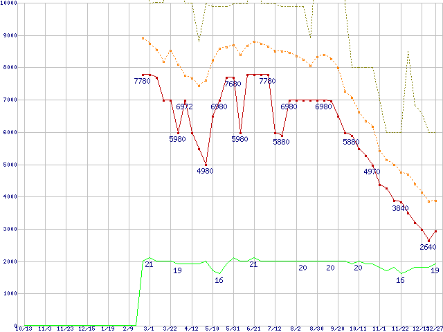 ※このグラフは過去のデータも税率5%相当に調整した税込み相当額のグラフです。 税率変更や、総額表示方式導入(2004年4月)の影響は除いています。 | | | ●凡例 | 最安値 (点線部は販売店未確認 または未調査) | 平均値 | 最高値 | ショップ数 |