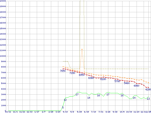 ※このグラフは過去のデータも税率5%相当に調整した税込み相当額のグラフです。 税率変更や、総額表示方式導入(2004年4月)の影響は除いています。 | | | ●凡例 | 最安値 (点線部は販売店未確認 または未調査) | 平均値 | 最高値 | ショップ数 |