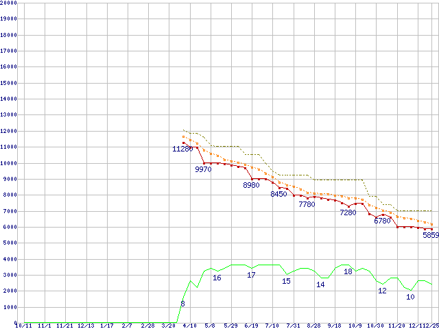 ※このグラフは過去のデータも税率5%相当に調整した税込み相当額のグラフです。 税率変更や、総額表示方式導入(2004年4月)の影響は除いています。 | | | ●凡例 | 最安値 (点線部は販売店未確認 または未調査) | 平均値 | 最高値 | ショップ数 |