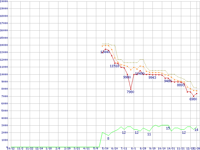 ※このグラフは過去のデータも税率5%相当に調整した税込み相当額のグラフです。 税率変更や、総額表示方式導入(2004年4月)の影響は除いています。 | | | ●凡例 | 最安値 (点線部は販売店未確認 または未調査) | 平均値 | 最高値 | ショップ数 |