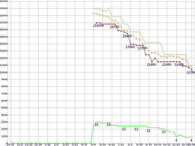 ※このグラフは過去のデータも税率5%相当に調整した税込み相当額のグラフです。 税率変更や、総額表示方式導入(2004年4月)の影響は除いています。 | | | ●凡例 | 最安値 (点線部は販売店未確認 または未調査) | 平均値 | 最高値 | ショップ数 |
