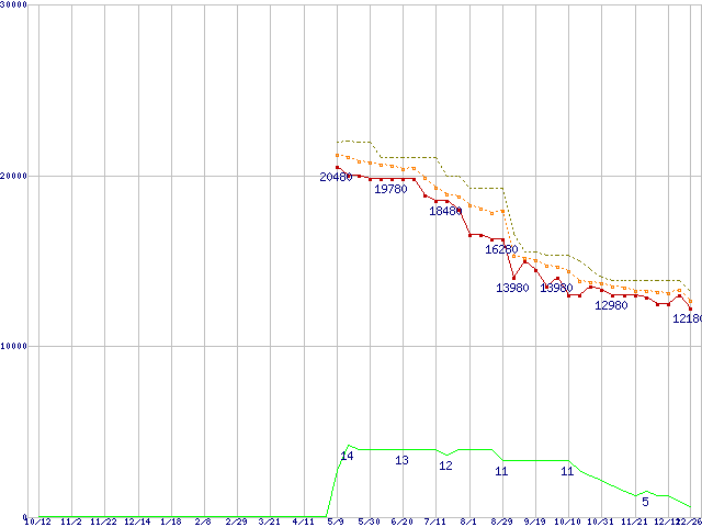 ※このグラフは過去のデータも税率5%相当に調整した税込み相当額のグラフです。 税率変更や、総額表示方式導入(2004年4月)の影響は除いています。 | | | ●凡例 | 最安値 (点線部は販売店未確認 または未調査) | 平均値 | 最高値 | ショップ数 |