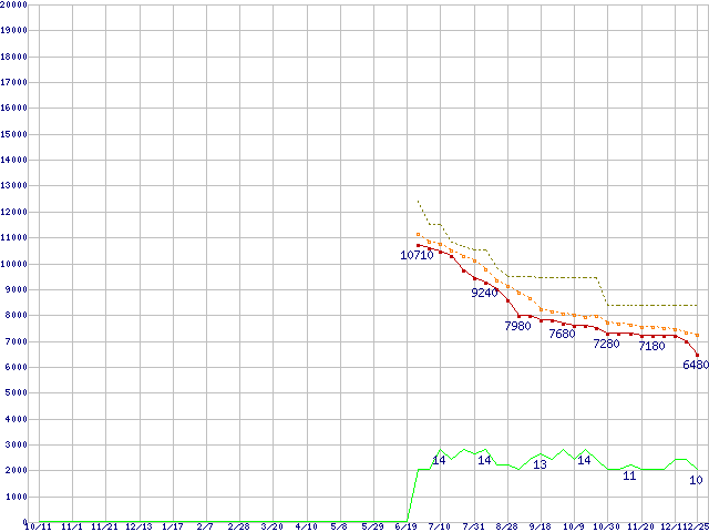 ※このグラフは過去のデータも税率5%相当に調整した税込み相当額のグラフです。 税率変更や、総額表示方式導入(2004年4月)の影響は除いています。 | | | ●凡例 | 最安値 (点線部は販売店未確認 または未調査) | 平均値 | 最高値 | ショップ数 |