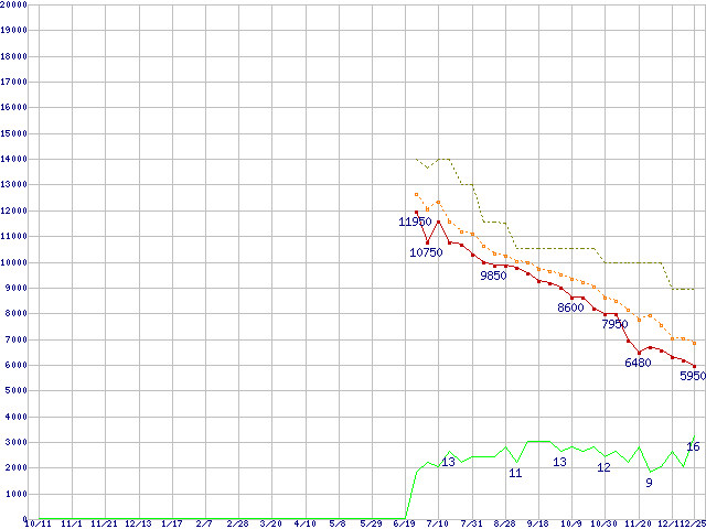 ※このグラフは過去のデータも税率5%相当に調整した税込み相当額のグラフです。 税率変更や、総額表示方式導入(2004年4月)の影響は除いています。 | | | ●凡例 | 最安値 (点線部は販売店未確認 または未調査) | 平均値 | 最高値 | ショップ数 |