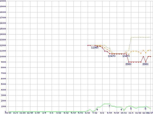 ※このグラフは過去のデータも税率5%相当に調整した税込み相当額のグラフです。 税率変更や、総額表示方式導入(2004年4月)の影響は除いています。 | | | ●凡例 | 最安値 (点線部は販売店未確認 または未調査) | 平均値 | 最高値 | ショップ数 |