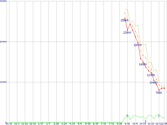 ※このグラフは過去のデータも税率5%相当に調整した税込み相当額のグラフです。 税率変更や、総額表示方式導入(2004年4月)の影響は除いています。 | | | ●凡例 | 最安値 (点線部は販売店未確認 または未調査) | 平均値 | 最高値 | ショップ数 |