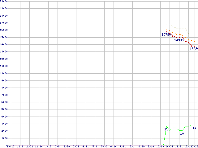 ※このグラフは過去のデータも税率5%相当に調整した税込み相当額のグラフです。 税率変更や、総額表示方式導入(2004年4月)の影響は除いています。 | | | ●凡例 | 最安値 (点線部は販売店未確認 または未調査) | 平均値 | 最高値 | ショップ数 |