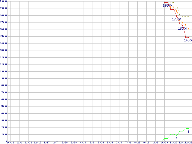 ※このグラフは過去のデータも税率5%相当に調整した税込み相当額のグラフです。 税率変更や、総額表示方式導入(2004年4月)の影響は除いています。 | | | ●凡例 | 最安値 (点線部は販売店未確認 または未調査) | 平均値 | 最高値 | ショップ数 |