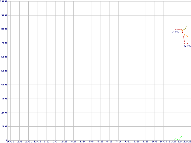 ※このグラフは過去のデータも税率5%相当に調整した税込み相当額のグラフです。 税率変更や、総額表示方式導入(2004年4月)の影響は除いています。 | | | ●凡例 | 最安値 (点線部は販売店未確認 または未調査) | 平均値 | 最高値 | ショップ数 |