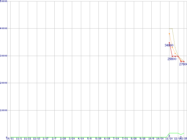 ※このグラフは過去のデータも税率5%相当に調整した税込み相当額のグラフです。 税率変更や、総額表示方式導入(2004年4月)の影響は除いています。 | | | ●凡例 | 最安値 (点線部は販売店未確認 または未調査) | 平均値 | 最高値 | ショップ数 |