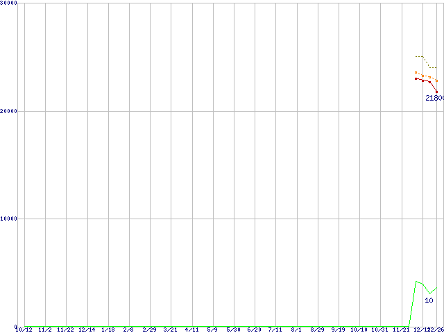 ※このグラフは過去のデータも税率5%相当に調整した税込み相当額のグラフです。 税率変更や、総額表示方式導入(2004年4月)の影響は除いています。 | | | ●凡例 | 最安値 (点線部は販売店未確認 または未調査) | 平均値 | 最高値 | ショップ数 |