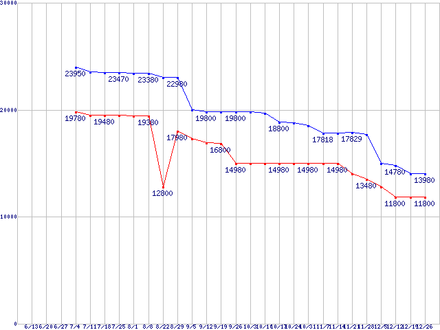| Socket AM2 (HyperTransport 3.0,Quad Core,TDP 65W)の最安値推移 | | | (2008年6月13日~2008年12月26日) |