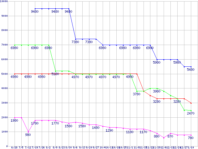 メモリ主要製品(最安値5千円未満)の最安値推移