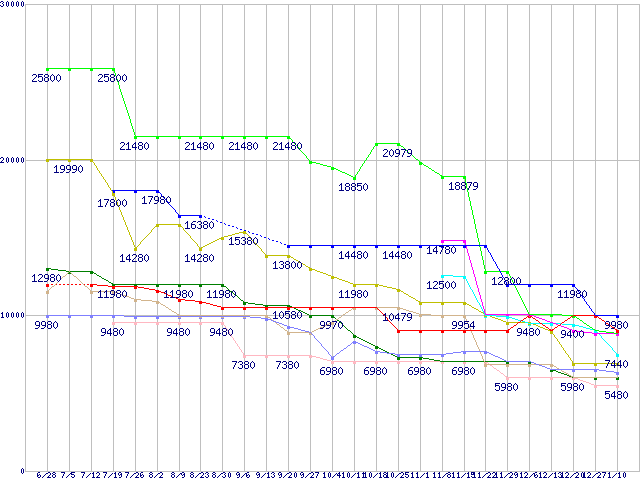 メモリ主要製品(最安値1万円以上)の最安値推移