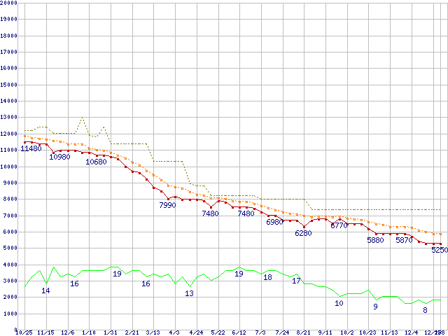 ※このグラフは過去のデータも税率5%相当に調整した税込み相当額のグラフです。 税率変更や、総額表示方式導入(2004年4月)の影響は除いています。 | | | ●凡例 | 最安値 (点線部は販売店未確認 または未調査) | 平均値 | 最高値 | ショップ数 |