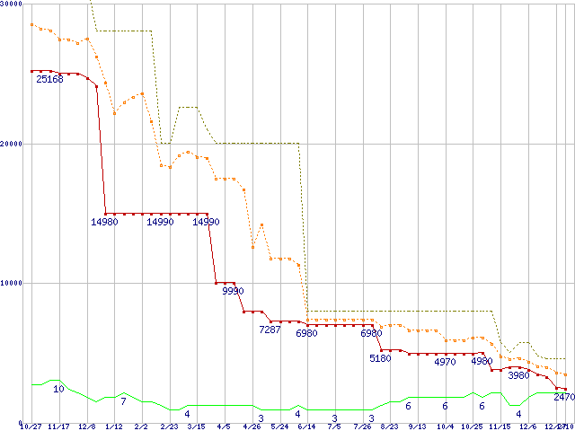 ※このグラフは過去のデータも税率5%相当に調整した税込み相当額のグラフです。 税率変更や、総額表示方式導入(2004年4月)の影響は除いています。 | | | ●凡例 | 最安値 (点線部は販売店未確認 または未調査) | 平均値 | 最高値 | ショップ数 |