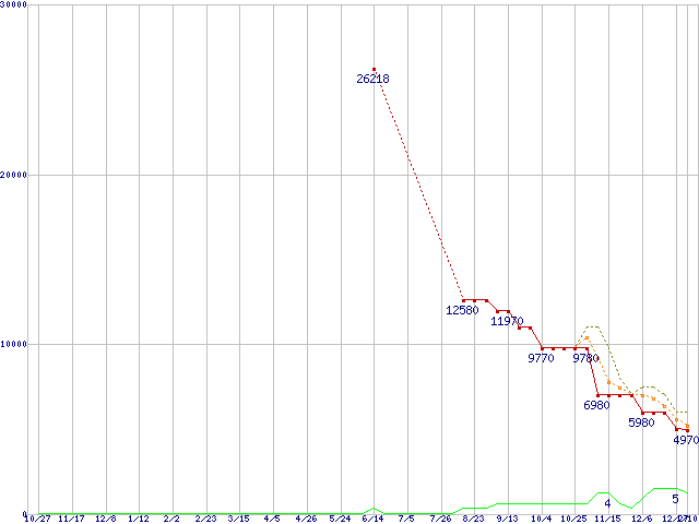 ※このグラフは過去のデータも税率5%相当に調整した税込み相当額のグラフです。 税率変更や、総額表示方式導入(2004年4月)の影響は除いています。 | | | ●凡例 | 最安値 (点線部は販売店未確認 または未調査) | 平均値 | 最高値 | ショップ数 |