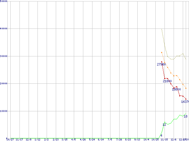 ※このグラフは過去のデータも税率5%相当に調整した税込み相当額のグラフです。 税率変更や、総額表示方式導入(2004年4月)の影響は除いています。 | | | ●凡例 | 最安値 (点線部は販売店未確認 または未調査) | 平均値 | 最高値 | ショップ数 |
