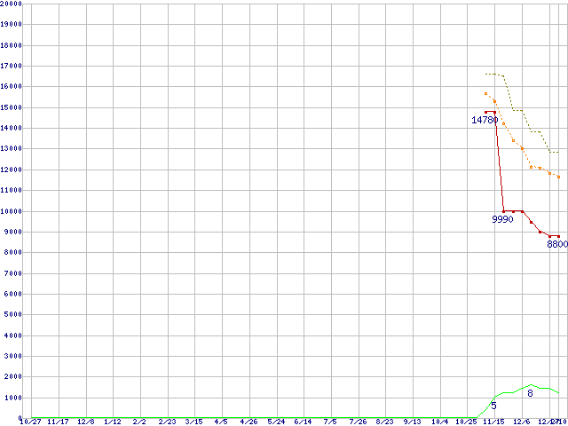 ※このグラフは過去のデータも税率5%相当に調整した税込み相当額のグラフです。 税率変更や、総額表示方式導入(2004年4月)の影響は除いています。 | | | ●凡例 | 最安値 (点線部は販売店未確認 または未調査) | 平均値 | 最高値 | ショップ数 |