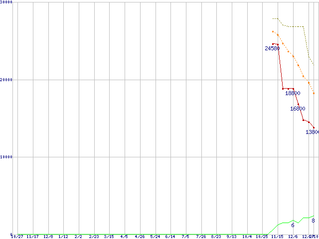 ※このグラフは過去のデータも税率5%相当に調整した税込み相当額のグラフです。 税率変更や、総額表示方式導入(2004年4月)の影響は除いています。 | | | ●凡例 | 最安値 (点線部は販売店未確認 または未調査) | 平均値 | 最高値 | ショップ数 |