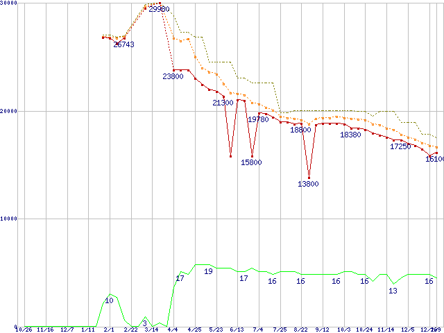 ※このグラフは過去のデータも税率5%相当に調整した税込み相当額のグラフです。 税率変更や、総額表示方式導入(2004年4月)の影響は除いています。 | | | ●凡例 | 最安値 (点線部は販売店未確認 または未調査) | 平均値 | 最高値 | ショップ数 |