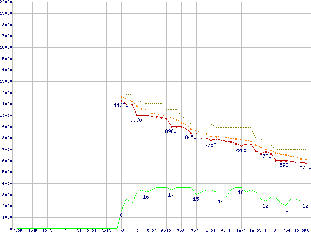 ※このグラフは過去のデータも税率5%相当に調整した税込み相当額のグラフです。 税率変更や、総額表示方式導入(2004年4月)の影響は除いています。 | | | ●凡例 | 最安値 (点線部は販売店未確認 または未調査) | 平均値 | 最高値 | ショップ数 |