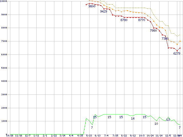※このグラフは過去のデータも税率5%相当に調整した税込み相当額のグラフです。 税率変更や、総額表示方式導入(2004年4月)の影響は除いています。 | | | ●凡例 | 最安値 (点線部は販売店未確認 または未調査) | 平均値 | 最高値 | ショップ数 |