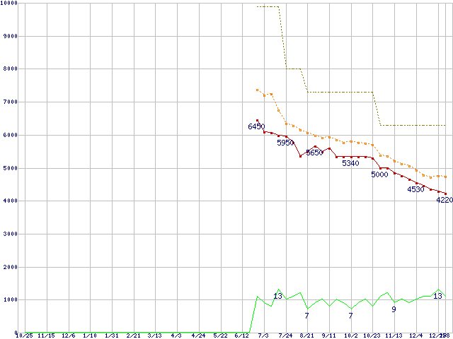 ※このグラフは過去のデータも税率5%相当に調整した税込み相当額のグラフです。 税率変更や、総額表示方式導入(2004年4月)の影響は除いています。 | | | ●凡例 | 最安値 (点線部は販売店未確認 または未調査) | 平均値 | 最高値 | ショップ数 |