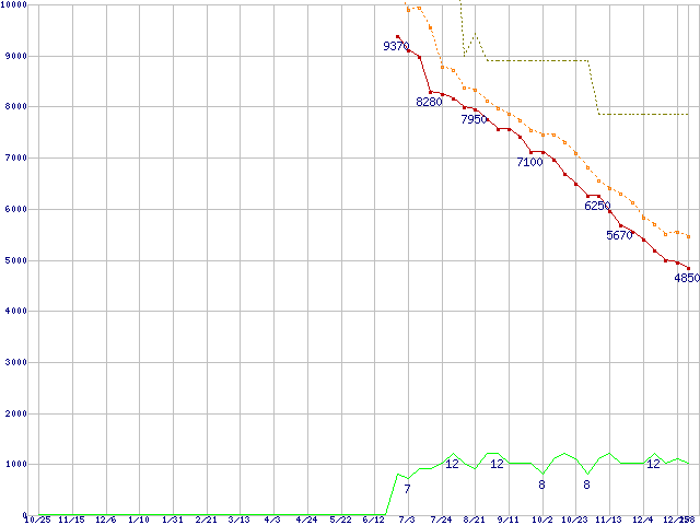 ※このグラフは過去のデータも税率5%相当に調整した税込み相当額のグラフです。 税率変更や、総額表示方式導入(2004年4月)の影響は除いています。 | | | ●凡例 | 最安値 (点線部は販売店未確認 または未調査) | 平均値 | 最高値 | ショップ数 |