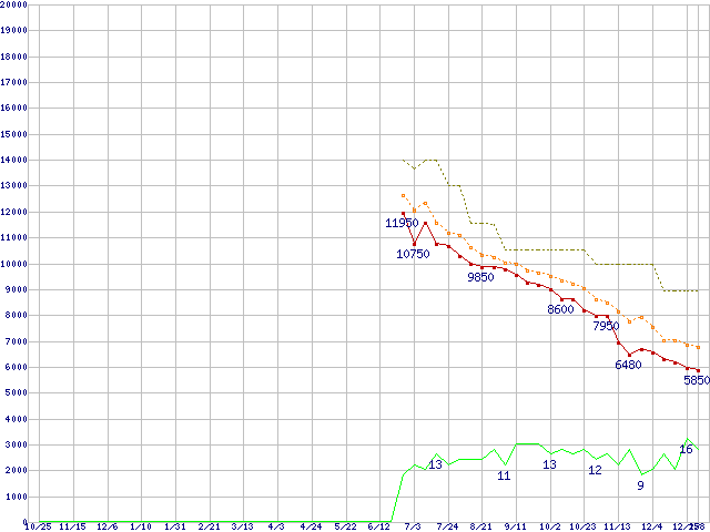 ※このグラフは過去のデータも税率5%相当に調整した税込み相当額のグラフです。 税率変更や、総額表示方式導入(2004年4月)の影響は除いています。 | | | ●凡例 | 最安値 (点線部は販売店未確認 または未調査) | 平均値 | 最高値 | ショップ数 |