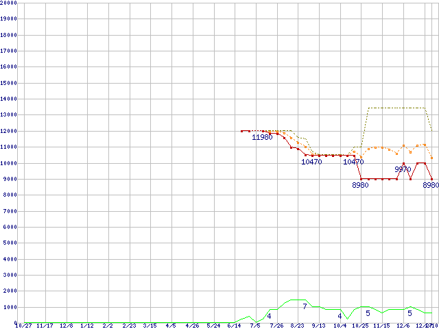 ※このグラフは過去のデータも税率5%相当に調整した税込み相当額のグラフです。 税率変更や、総額表示方式導入(2004年4月)の影響は除いています。 | | | ●凡例 | 最安値 (点線部は販売店未確認 または未調査) | 平均値 | 最高値 | ショップ数 |