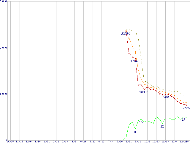 ※このグラフは過去のデータも税率5%相当に調整した税込み相当額のグラフです。 税率変更や、総額表示方式導入(2004年4月)の影響は除いています。 | | | ●凡例 | 最安値 (点線部は販売店未確認 または未調査) | 平均値 | 最高値 | ショップ数 |