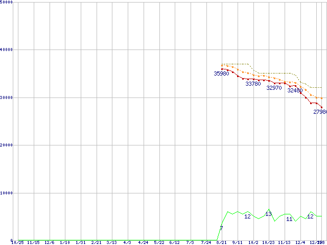※このグラフは過去のデータも税率5%相当に調整した税込み相当額のグラフです。 税率変更や、総額表示方式導入(2004年4月)の影響は除いています。 | | | ●凡例 | 最安値 (点線部は販売店未確認 または未調査) | 平均値 | 最高値 | ショップ数 |
