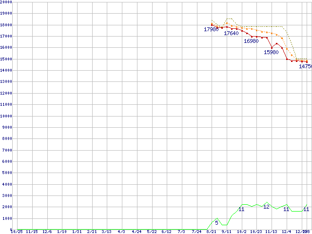 ※このグラフは過去のデータも税率5%相当に調整した税込み相当額のグラフです。 税率変更や、総額表示方式導入(2004年4月)の影響は除いています。 | | | ●凡例 | 最安値 (点線部は販売店未確認 または未調査) | 平均値 | 最高値 | ショップ数 |
