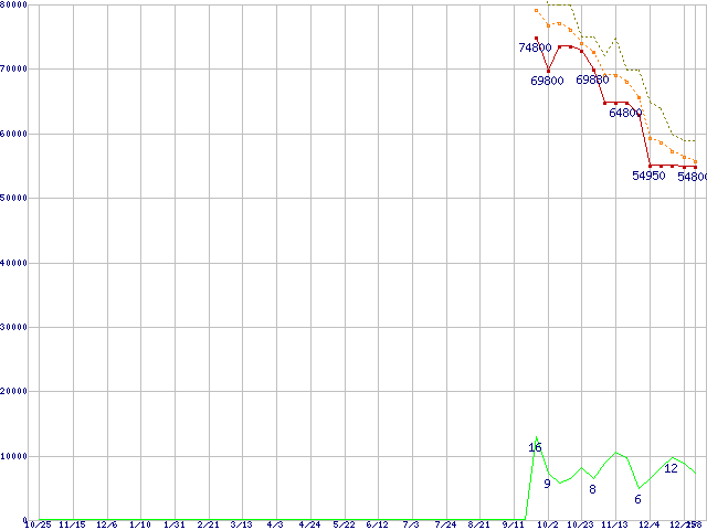 ※このグラフは過去のデータも税率5%相当に調整した税込み相当額のグラフです。 税率変更や、総額表示方式導入(2004年4月)の影響は除いています。 | | | ●凡例 | 最安値 (点線部は販売店未確認 または未調査) | 平均値 | 最高値 | ショップ数 |