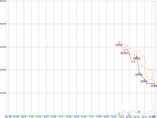 ※このグラフは過去のデータも税率5%相当に調整した税込み相当額のグラフです。 税率変更や、総額表示方式導入(2004年4月)の影響は除いています。 | | | ●凡例 | 最安値 (点線部は販売店未確認 または未調査) | 平均値 | 最高値 | ショップ数 |