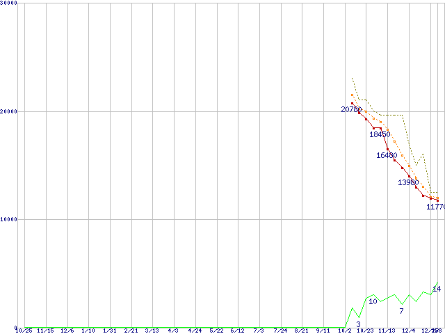 ※このグラフは過去のデータも税率5%相当に調整した税込み相当額のグラフです。 税率変更や、総額表示方式導入(2004年4月)の影響は除いています。 | | | ●凡例 | 最安値 (点線部は販売店未確認 または未調査) | 平均値 | 最高値 | ショップ数 |