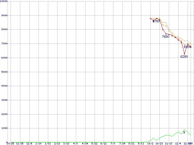 ※このグラフは過去のデータも税率5%相当に調整した税込み相当額のグラフです。 税率変更や、総額表示方式導入(2004年4月)の影響は除いています。 | | | ●凡例 | 最安値 (点線部は販売店未確認 または未調査) | 平均値 | 最高値 | ショップ数 |
