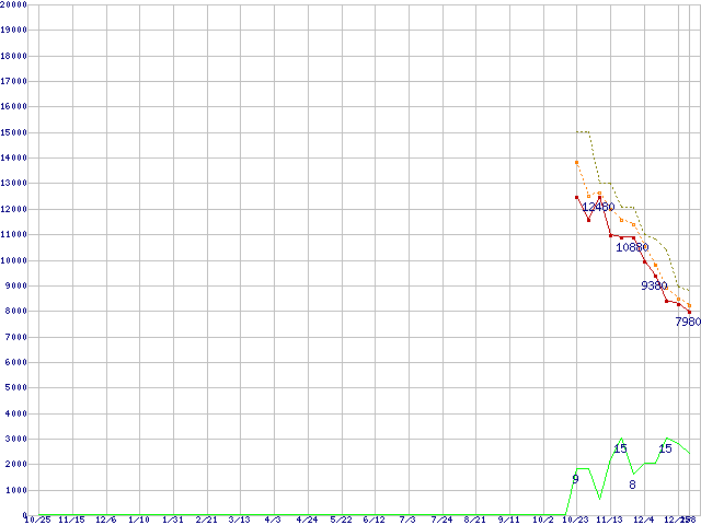 ※このグラフは過去のデータも税率5%相当に調整した税込み相当額のグラフです。 税率変更や、総額表示方式導入(2004年4月)の影響は除いています。 | | | ●凡例 | 最安値 (点線部は販売店未確認 または未調査) | 平均値 | 最高値 | ショップ数 |