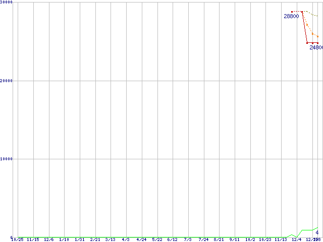 ※このグラフは過去のデータも税率5%相当に調整した税込み相当額のグラフです。 税率変更や、総額表示方式導入(2004年4月)の影響は除いています。 | | | ●凡例 | 最安値 (点線部は販売店未確認 または未調査) | 平均値 | 最高値 | ショップ数 |