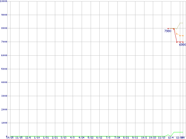 ※このグラフは過去のデータも税率5%相当に調整した税込み相当額のグラフです。 税率変更や、総額表示方式導入(2004年4月)の影響は除いています。 | | | ●凡例 | 最安値 (点線部は販売店未確認 または未調査) | 平均値 | 最高値 | ショップ数 |