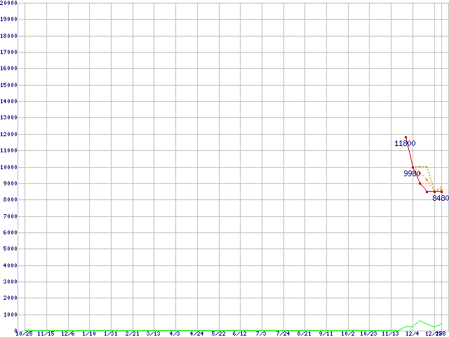 ※このグラフは過去のデータも税率5%相当に調整した税込み相当額のグラフです。 税率変更や、総額表示方式導入(2004年4月)の影響は除いています。 | | | ●凡例 | 最安値 (点線部は販売店未確認 または未調査) | 平均値 | 最高値 | ショップ数 |