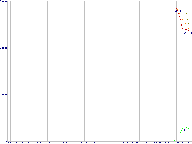 ※このグラフは過去のデータも税率5%相当に調整した税込み相当額のグラフです。 税率変更や、総額表示方式導入(2004年4月)の影響は除いています。 | | | ●凡例 | 最安値 (点線部は販売店未確認 または未調査) | 平均値 | 最高値 | ショップ数 |