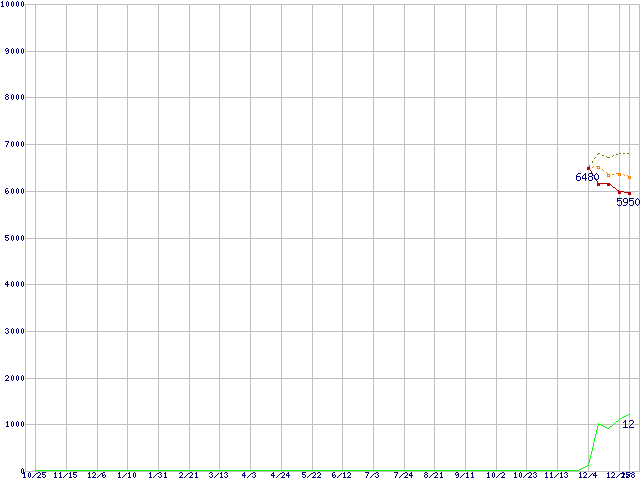 ※このグラフは過去のデータも税率5%相当に調整した税込み相当額のグラフです。 税率変更や、総額表示方式導入(2004年4月)の影響は除いています。 | | | ●凡例 | 最安値 (点線部は販売店未確認 または未調査) | 平均値 | 最高値 | ショップ数 |
