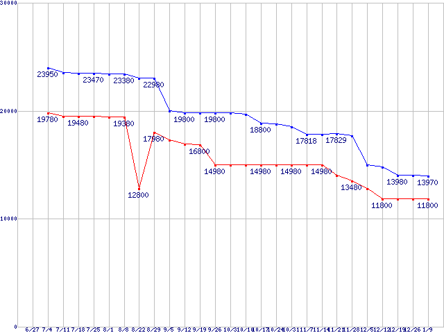 | Socket AM2 (HyperTransport 3.0,Quad Core,TDP 65W)の最安値推移 | | | (2008年6月27日~2009年1月9日) |