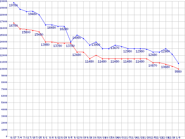 | Socket AM2 (HyperTransport 3.0,Triple Core,TDP 95W)の最安値推移 | | | (2008年6月27日~2009年1月9日) |