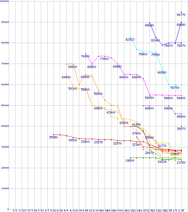 | HDD/SSD主要製品(最安値2万円以上)の最安値推移 | | | (2008年7月3日~2009年1月15日) |