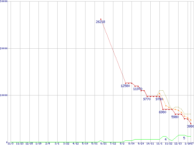 ※このグラフは過去のデータも税率5%相当に調整した税込み相当額のグラフです。 税率変更や、総額表示方式導入(2004年4月)の影響は除いています。 | | | ●凡例 | 最安値 (点線部は販売店未確認 または未調査) | 平均値 | 最高値 | ショップ数 |
