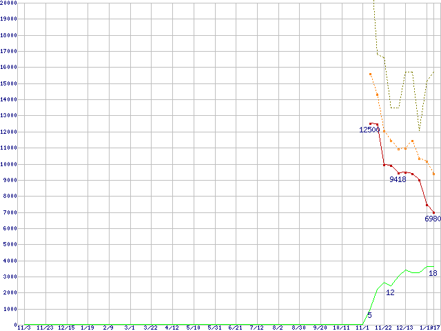 ※このグラフは過去のデータも税率5%相当に調整した税込み相当額のグラフです。 税率変更や、総額表示方式導入(2004年4月)の影響は除いています。 | | | ●凡例 | 最安値 (点線部は販売店未確認 または未調査) | 平均値 | 最高値 | ショップ数 |