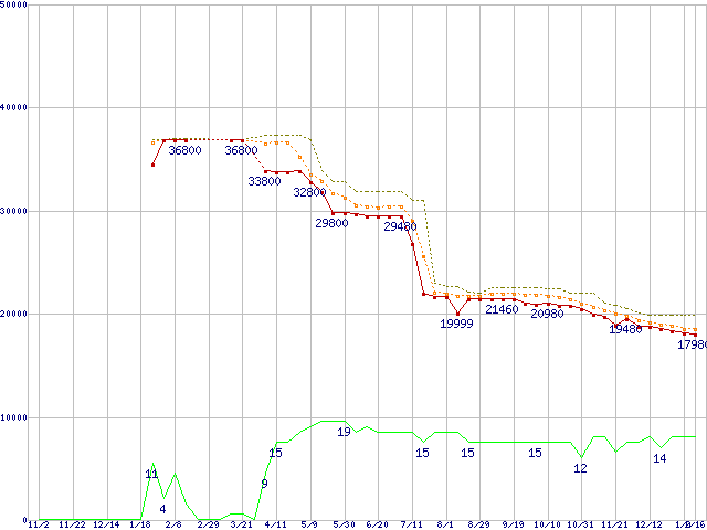 | Core 2 Duo E8500 (3.16GHz,L2 6MB)の価格推移 | | | (2007年11月2日~2009年1月16日) |